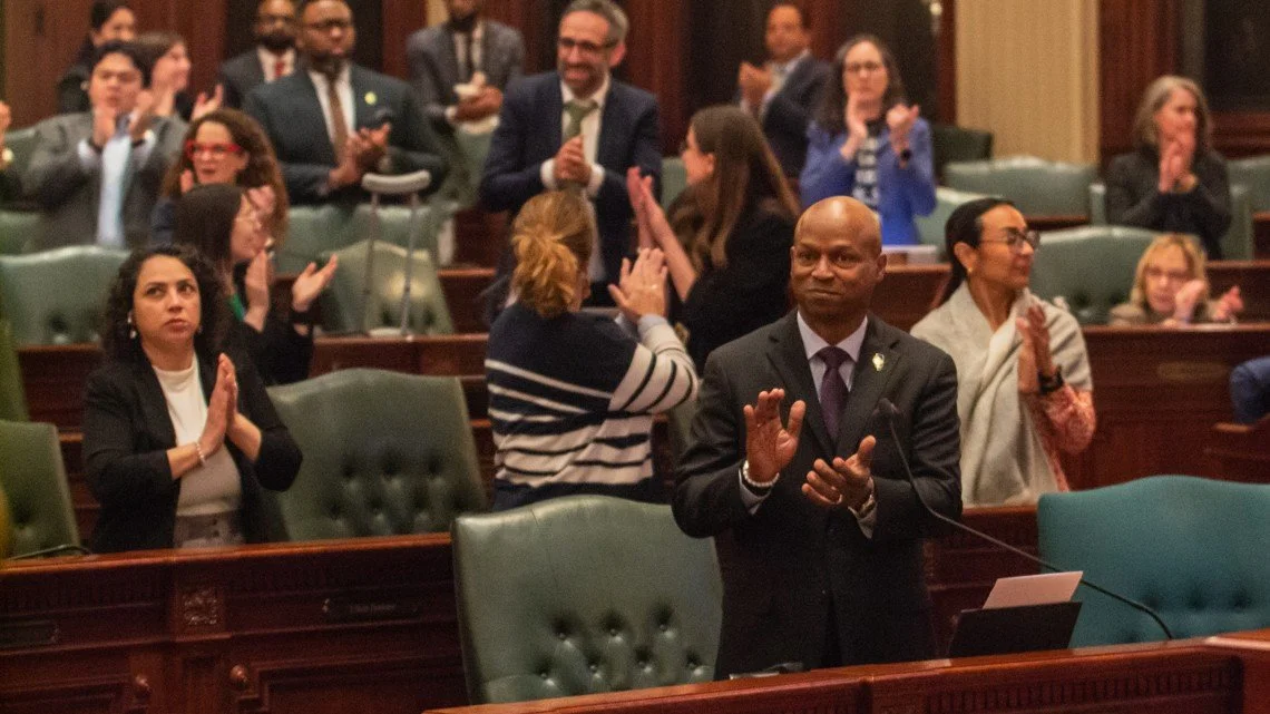 House Speaker Chris Welch acknowledges his staff on the House floor early Sunday morning after the House advanced an FY26 budget. (Photo: Capitol News Illinois)