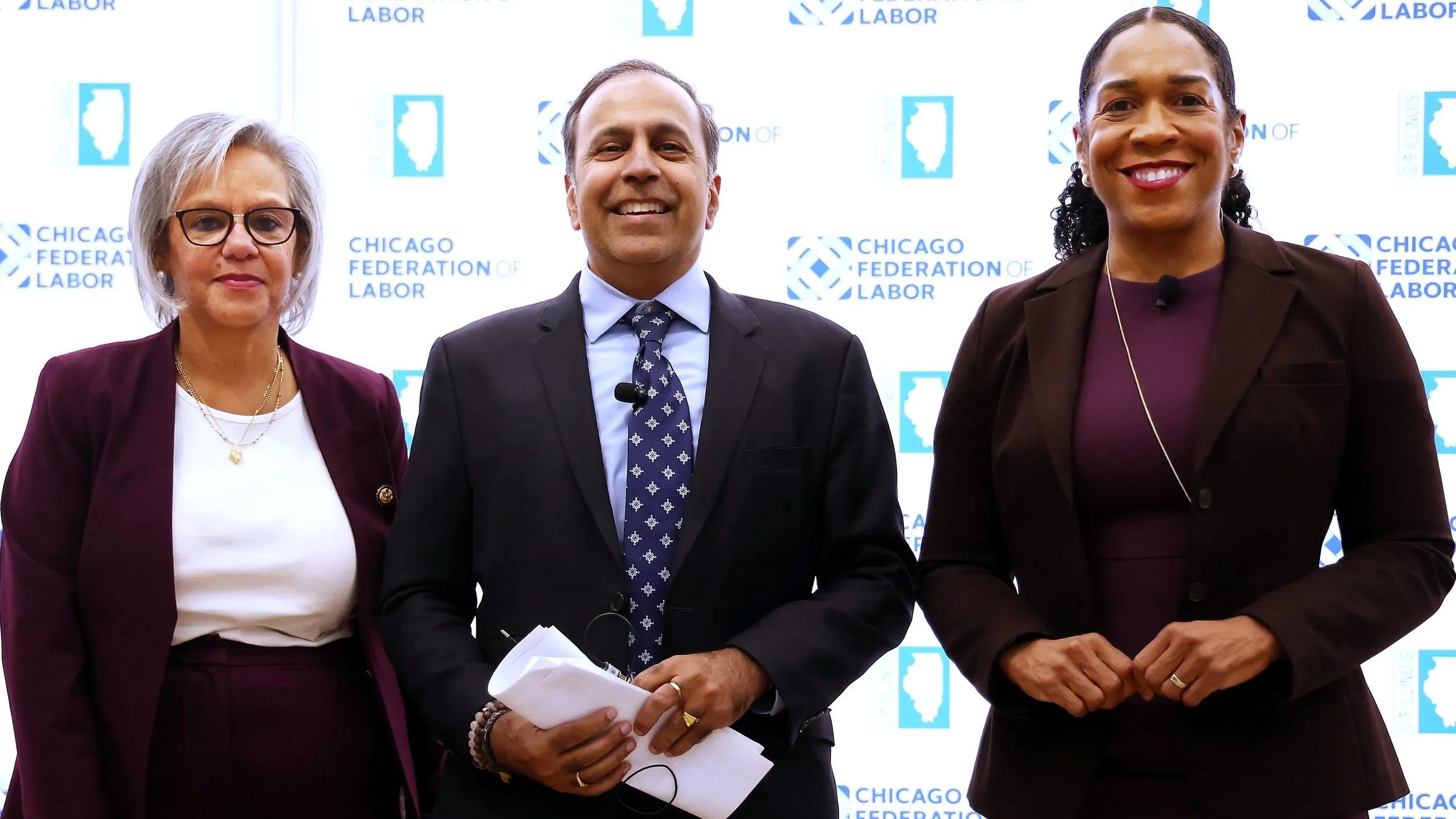 Congresswoman Robin Kelly (D-Lynwood), Congressman Raja Krishnamoorthi (D-Schaumburg), and Lt. Governor Juliana Stratton pose for a photo before a joint forum at a union hall last year.
