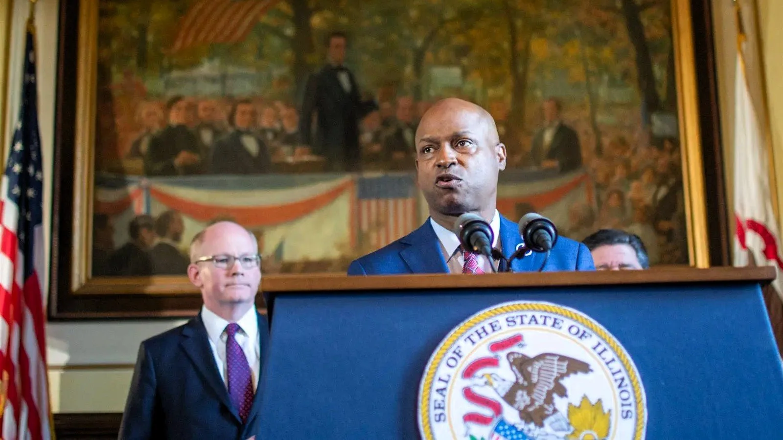 House Speaker Chris Welch and Senate President Don Harmon at a news conference in 2023.