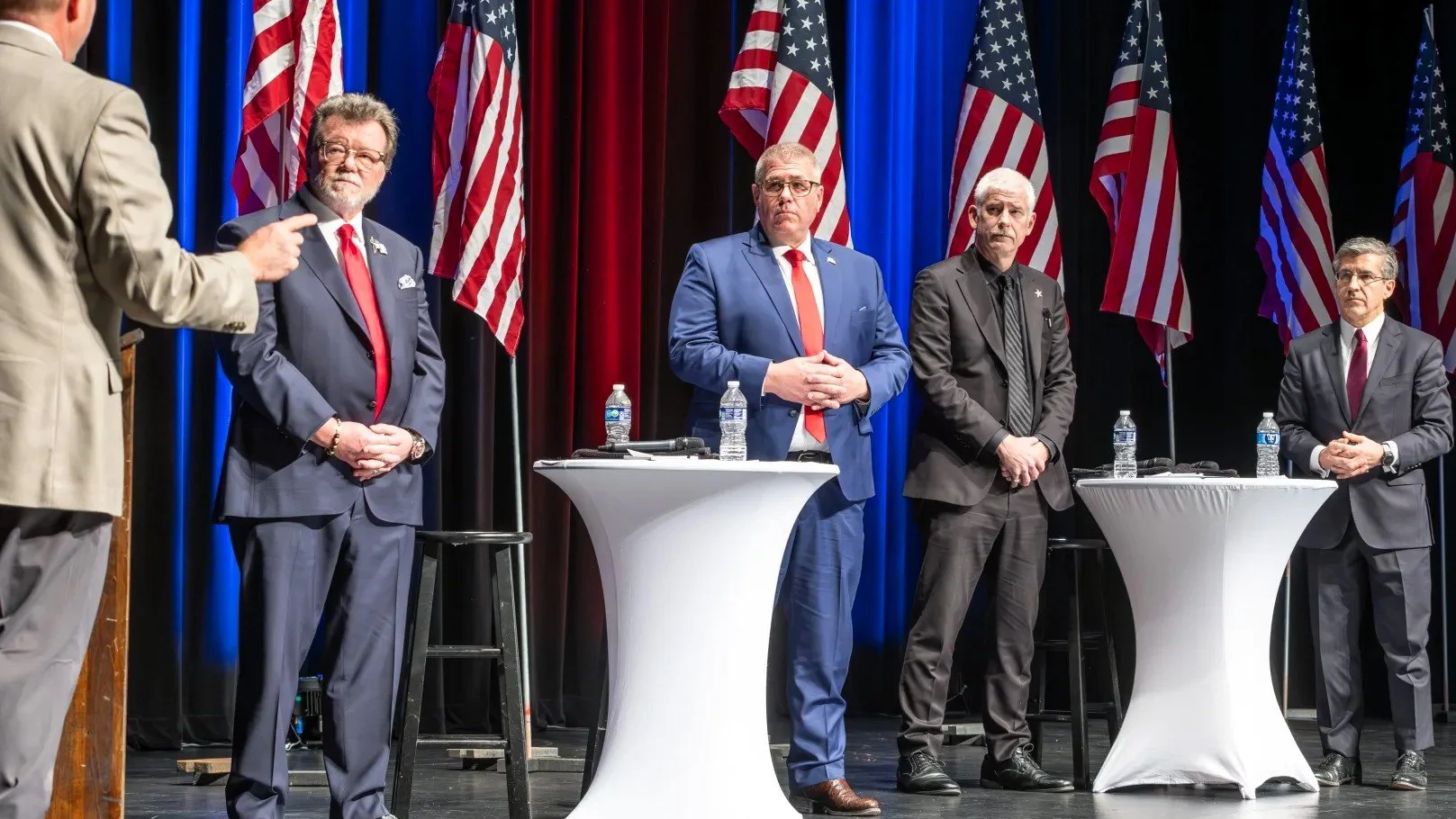 The four major GOP candidates for Governor, businessman Rick Heidner, former Sen. Darren Bailey, DuPage County Sheriff Jim Mendrick, and conservative policy activist Ted Dabrowski at a forum in Tazewell County earlier this month.