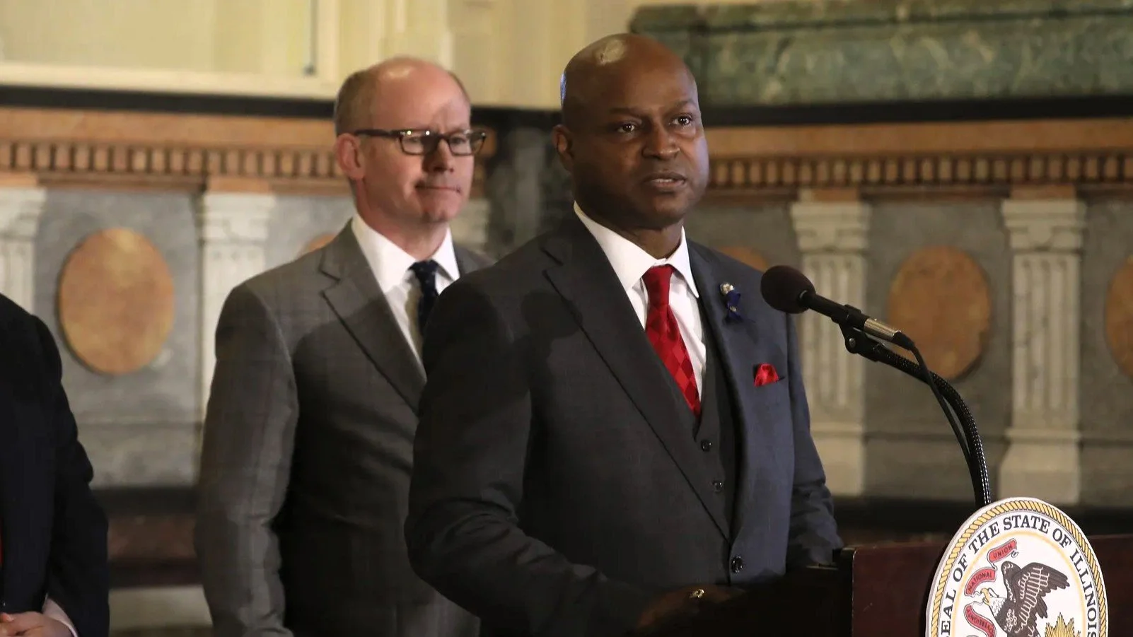 House Speaker Chris Welch and Senate President Don Harmon at a news conference in Springfield in 2022. (Photo: Chicago Tribune)