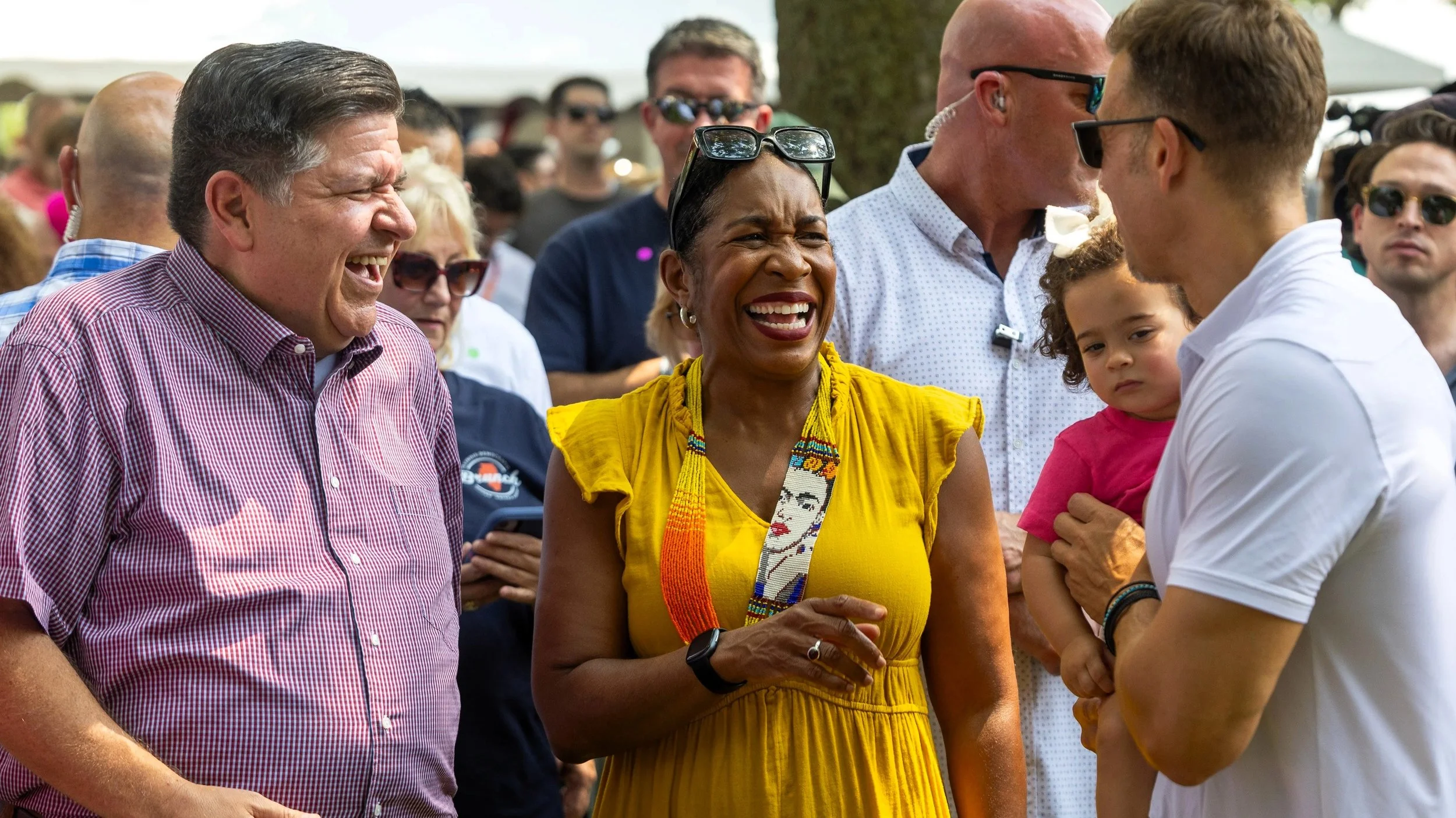 Gov. JB Pritzker, Lt. Governor Juliana Stratton, and Secretary of State Alexi Giannoulias share a laugh on Governor’s Day at the State Fair. (Photo: Chicago Tribune)