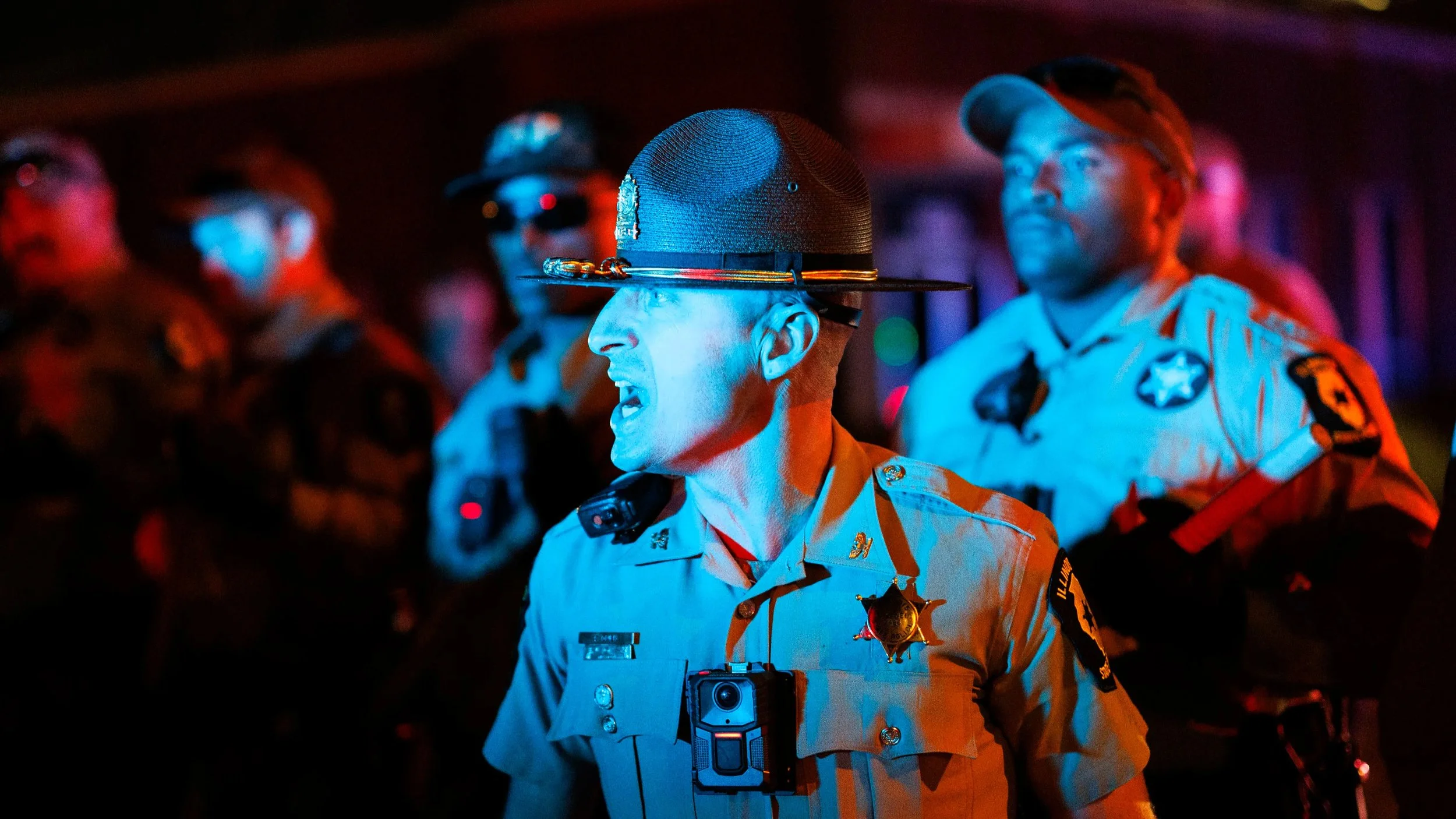 An Illinois State Police trooper yells at protestors outside of the ICE Processing Facility in Broadview last weekend. (Photo: Chicago Tribune)