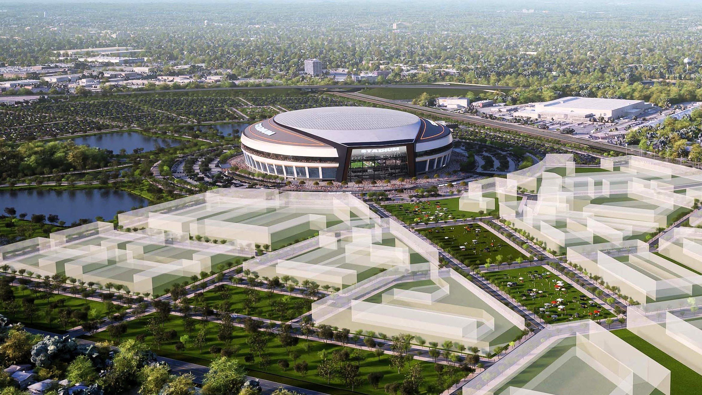 A rendering of a new Chicago Bears stadium and development in suburban Arlington Heights.