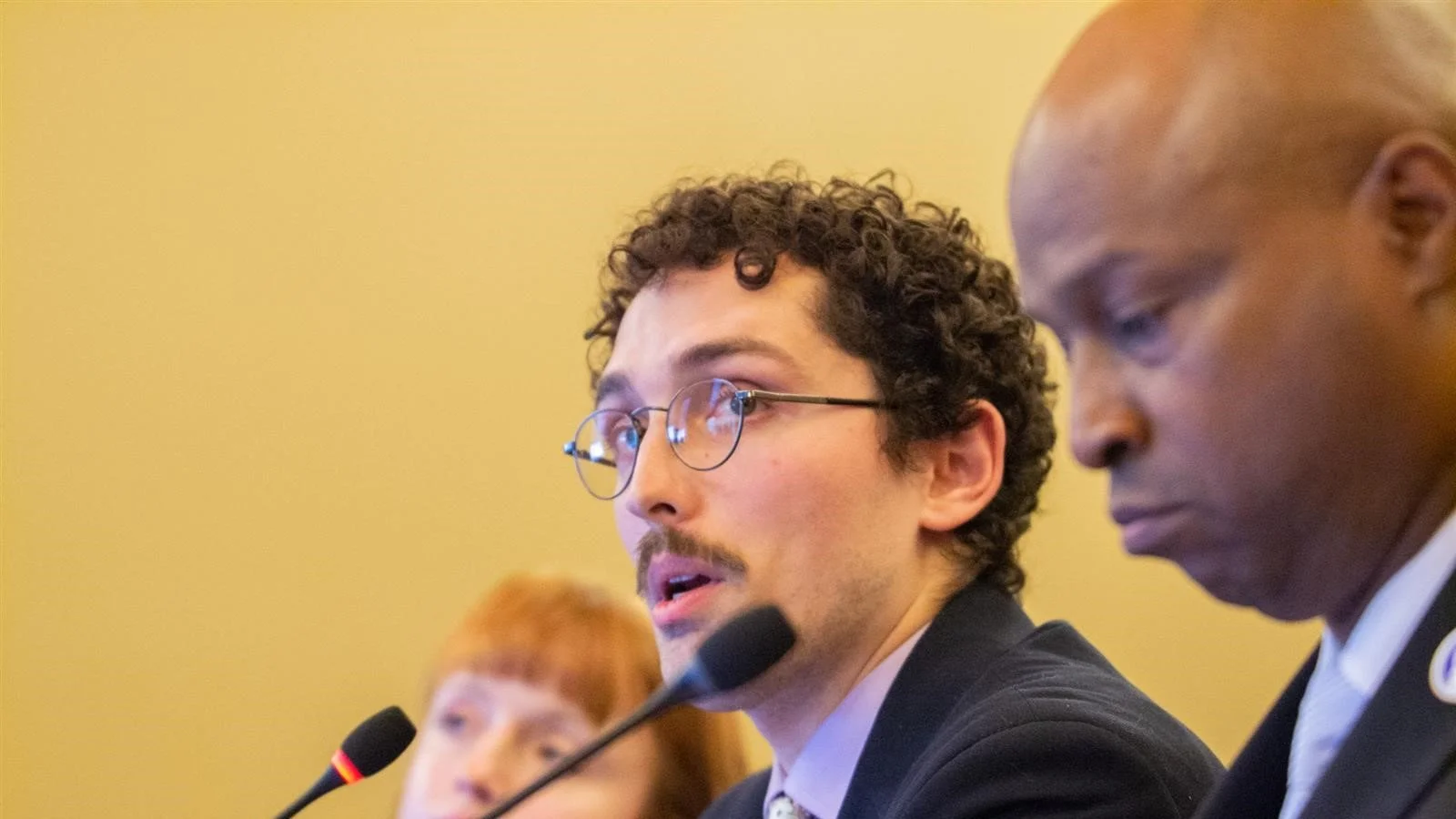 House Democrat staffer Brady Burden (center) and House Speaker Chris Welch testify in support of a bill to allow staff to form a union last November. (Photo: Capitol News Illinois)